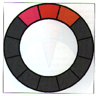 WarmThe hues of magenta, red, orange, yellow, and yellow-green are generally referred to as the warm colors. These colors produce a synaesthetic experience of heat in most viewers. Studies have been conducted in which test subjects were placed in rooms painted in a warm color and their perceptions of the room's temperature was almost always much warmer than its actual temperature. The warmth that these colors radiate tends to make them seem warm, cozy, and inviting and they draw attention very easily. Psychologically warm colors are associated with happiness arid comfort. Completely warm color schemes have the advantage of being pleasantly inviting and inherently harmonious. Warm color schemes with no variety, however, have the disadvantage of being tremendously dull with no Inherent eye-catching color |