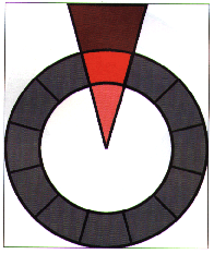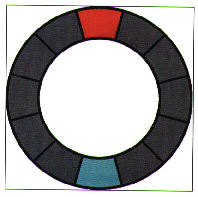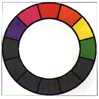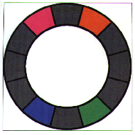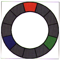 Additive Color WheelThere are few color wheels today that demonstrate the principles of additive color mixing. This is unfortunate bccause the expanding boundaries of digital and electronic media make using such a wheel more important than ever.The additive color wheel has a superficial resemblance to the subtractive color wheel, but the balance of colors is radically different. The nature of the primaries of light tends to favor a heavy distribution of blues and greens, whereas yellow and red make only a slight impact on the color wheel. This same sort of distribution can be observed in the spectrum, which is dominated by the blue wavelengths of light whereas short shrift is given to the red wavelengths. |